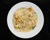 Grilled chicken breast served in garlic & oil, white wine sauce, with diced tomatoes, & diced fresh mozzarella